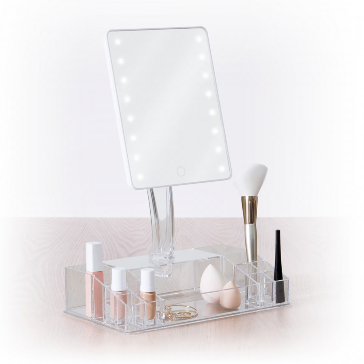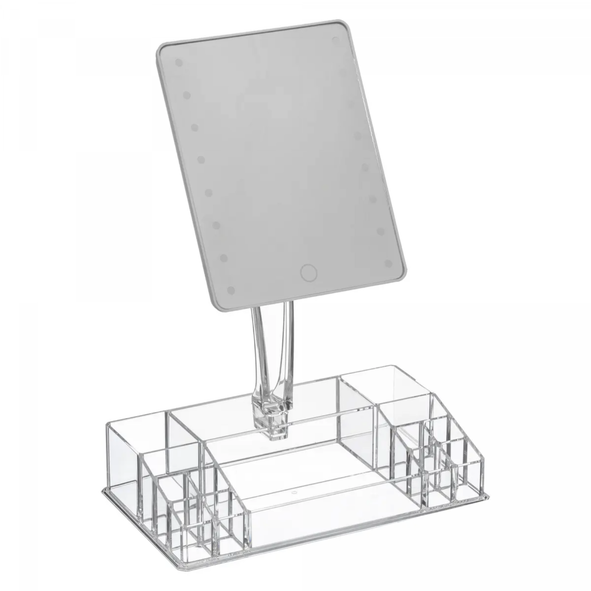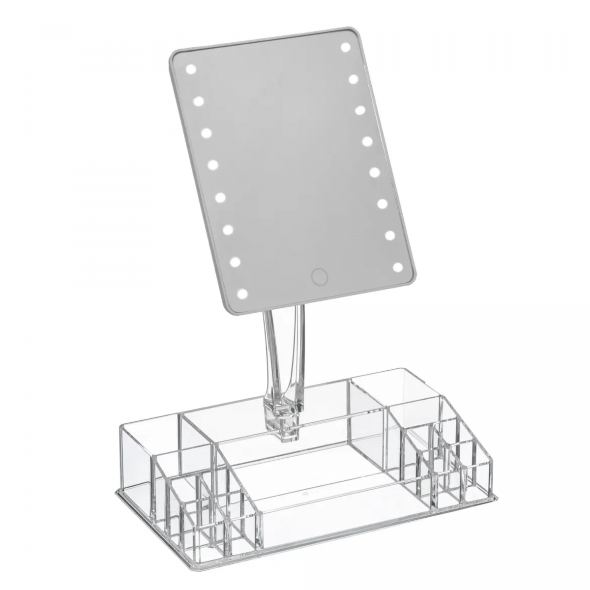 Organiza tus cosméticos y obtén la iluminación perfecta para tu rutina de belleza con el Organizador de Maquillaje con Espejo y 16 LEDs Regulables. Este práctico accesorio combina funcionalidad y estilo, permitiéndote mantener tus productos ordenados y maquillarte con una luz uniforme y ajustable.